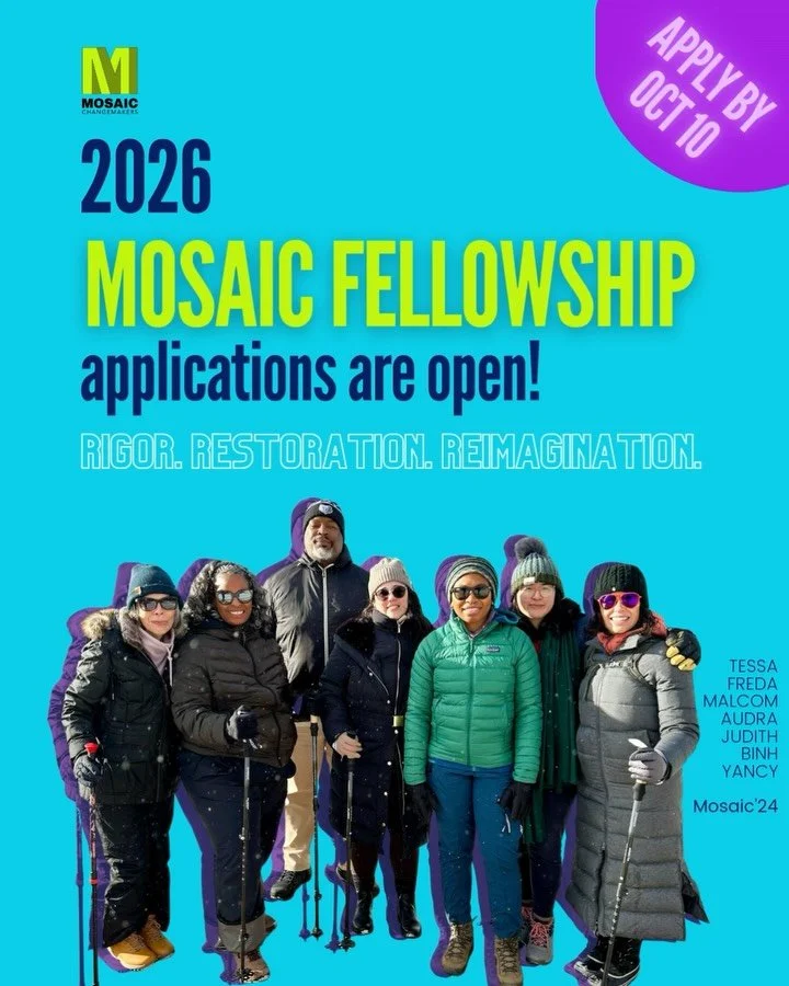 You’ll hear about the work of our growing community of changemakers. We’ll recommend books, films and mo’ from the Mosaic Fellowship syllabus. And you will be the first to know about the lineup for our next Mosaic Minds & Musings convergence — and other revelations.